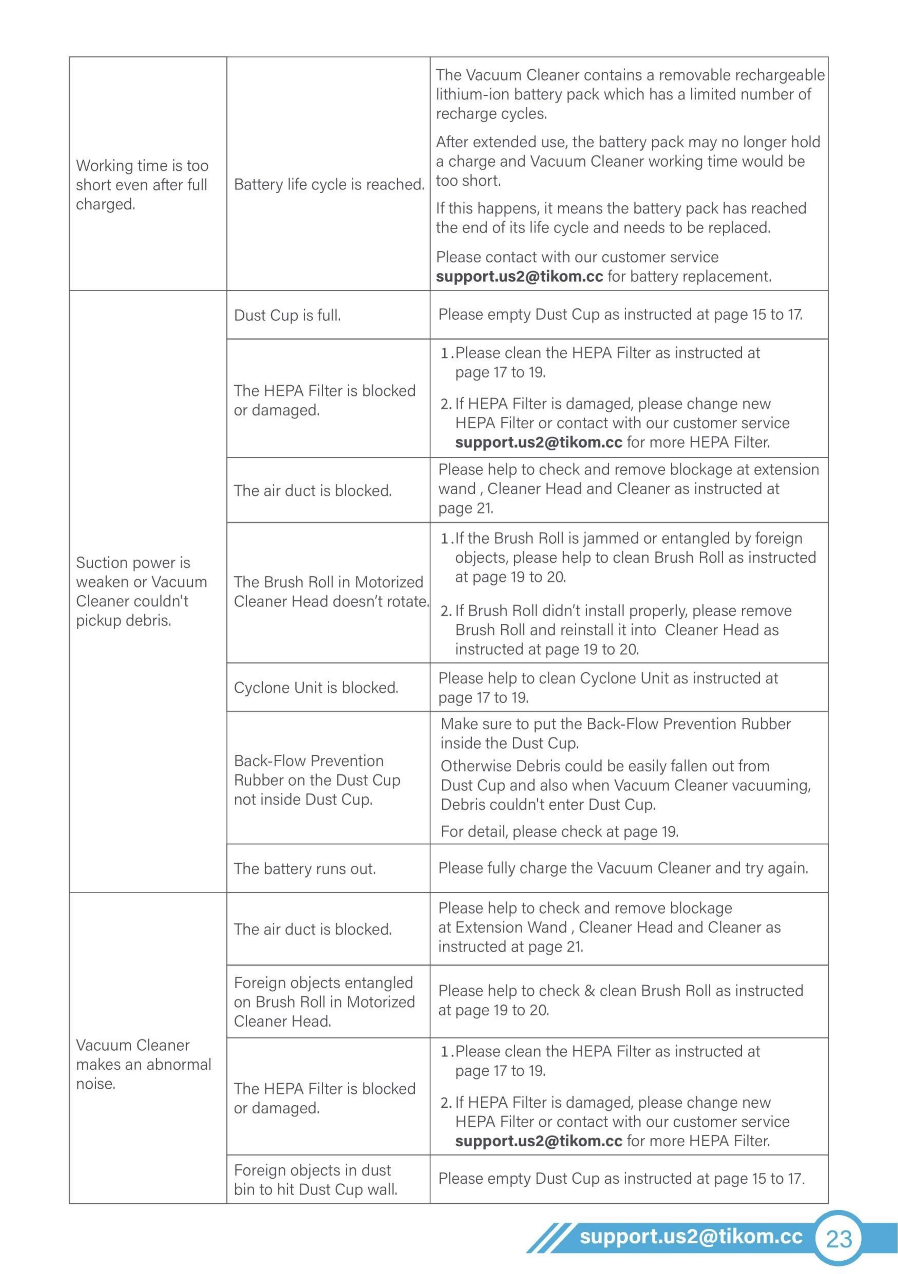 Please empty Dust Cup as instructed at page 15 to 17.