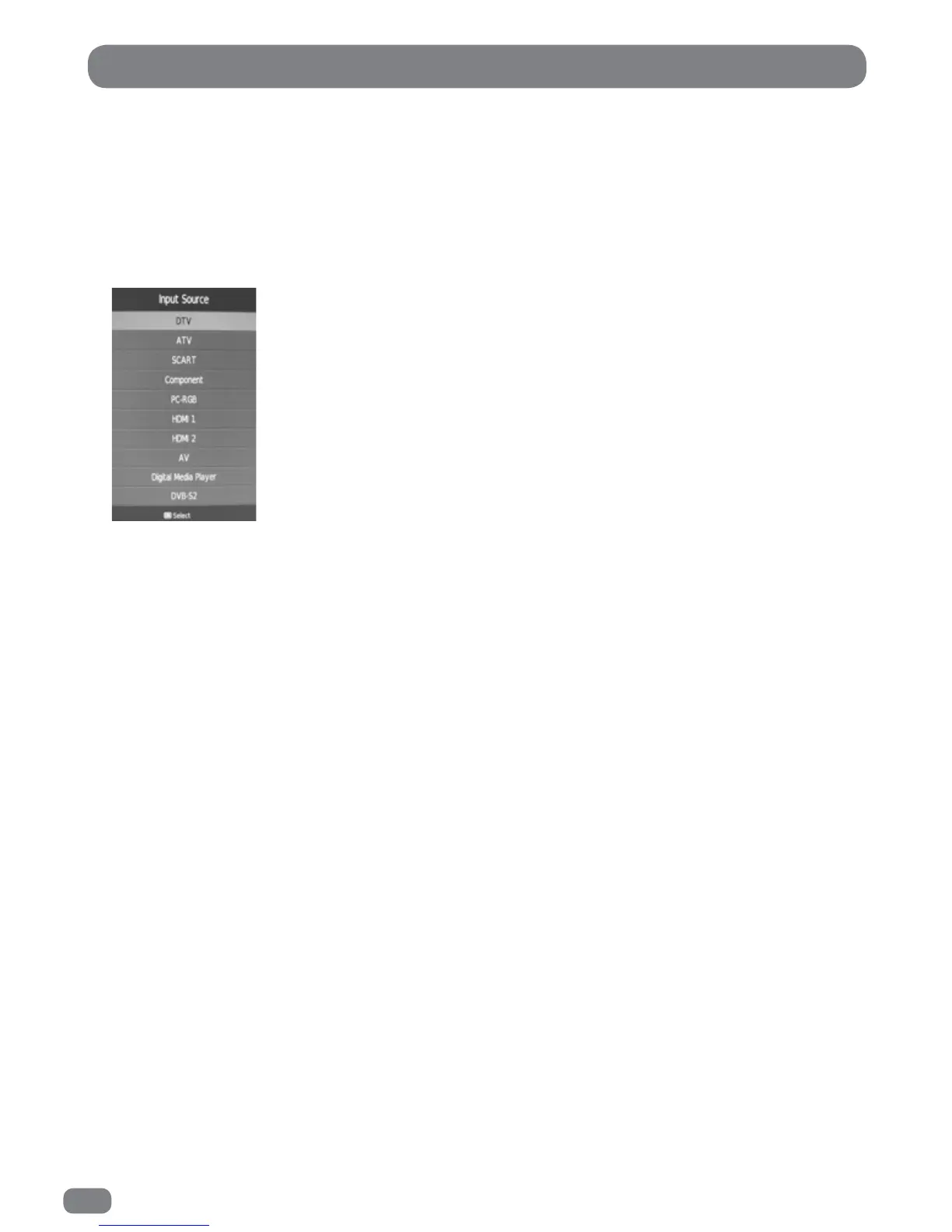 The Input Source list allows selection of the following: DTV (Digital Television), ATV (Analogue Television),