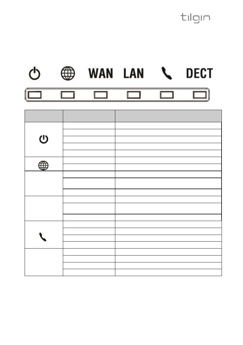 The front panel LEDs indicates the status of the Home Gateway, its services
