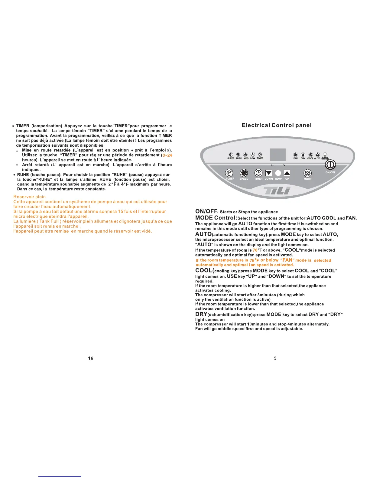 Tili TM11VR - Operation Modes and Controls; Timer, Pause, and Tank Full; Control Panel Functions
