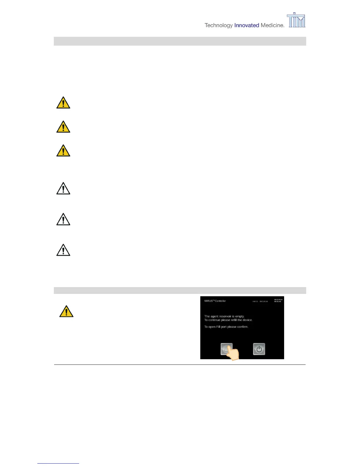 If liquid volume level in reservoir is less than 75 mL, MIRUS Controller will require filling prior