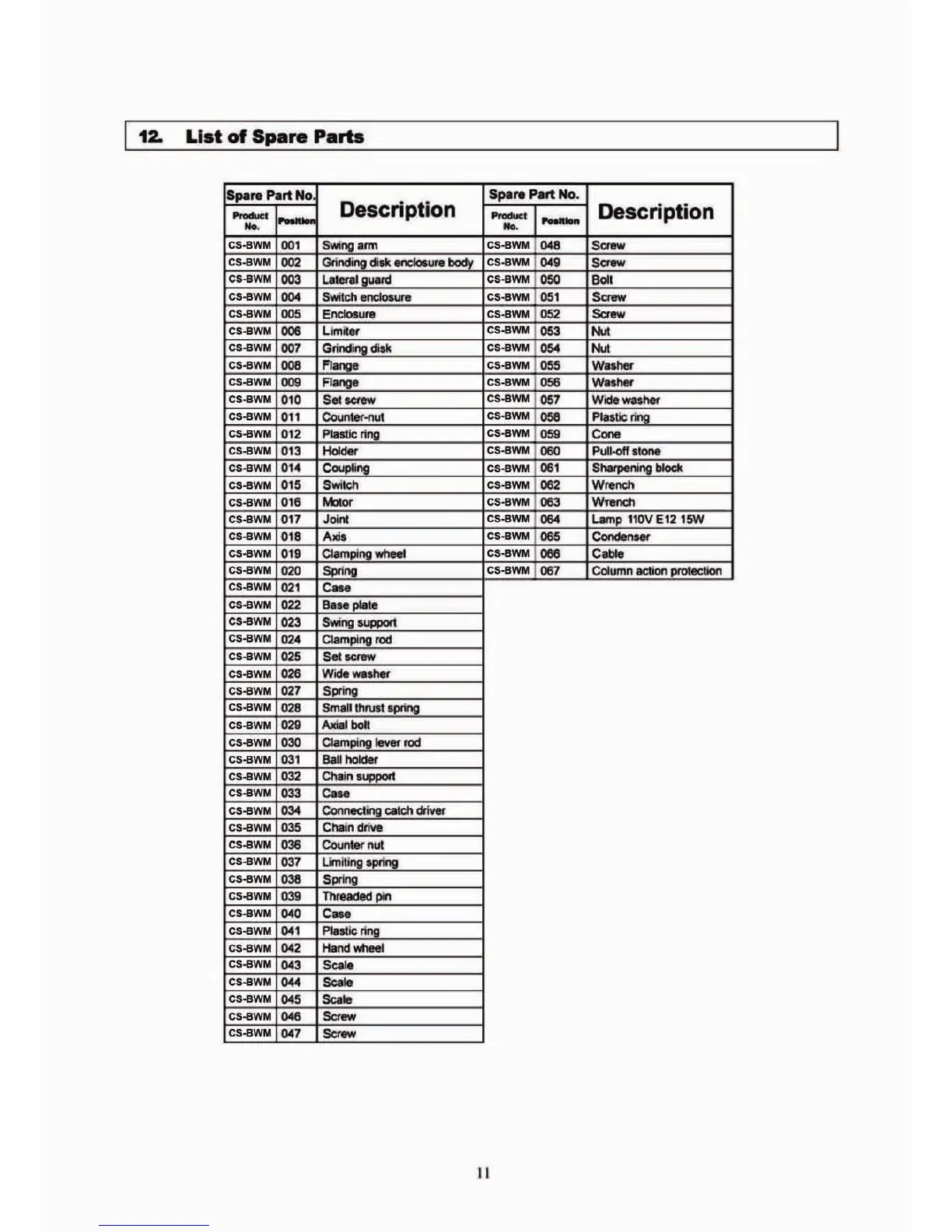 Timber Tuff Tools CS-BWM - List of Spare Parts