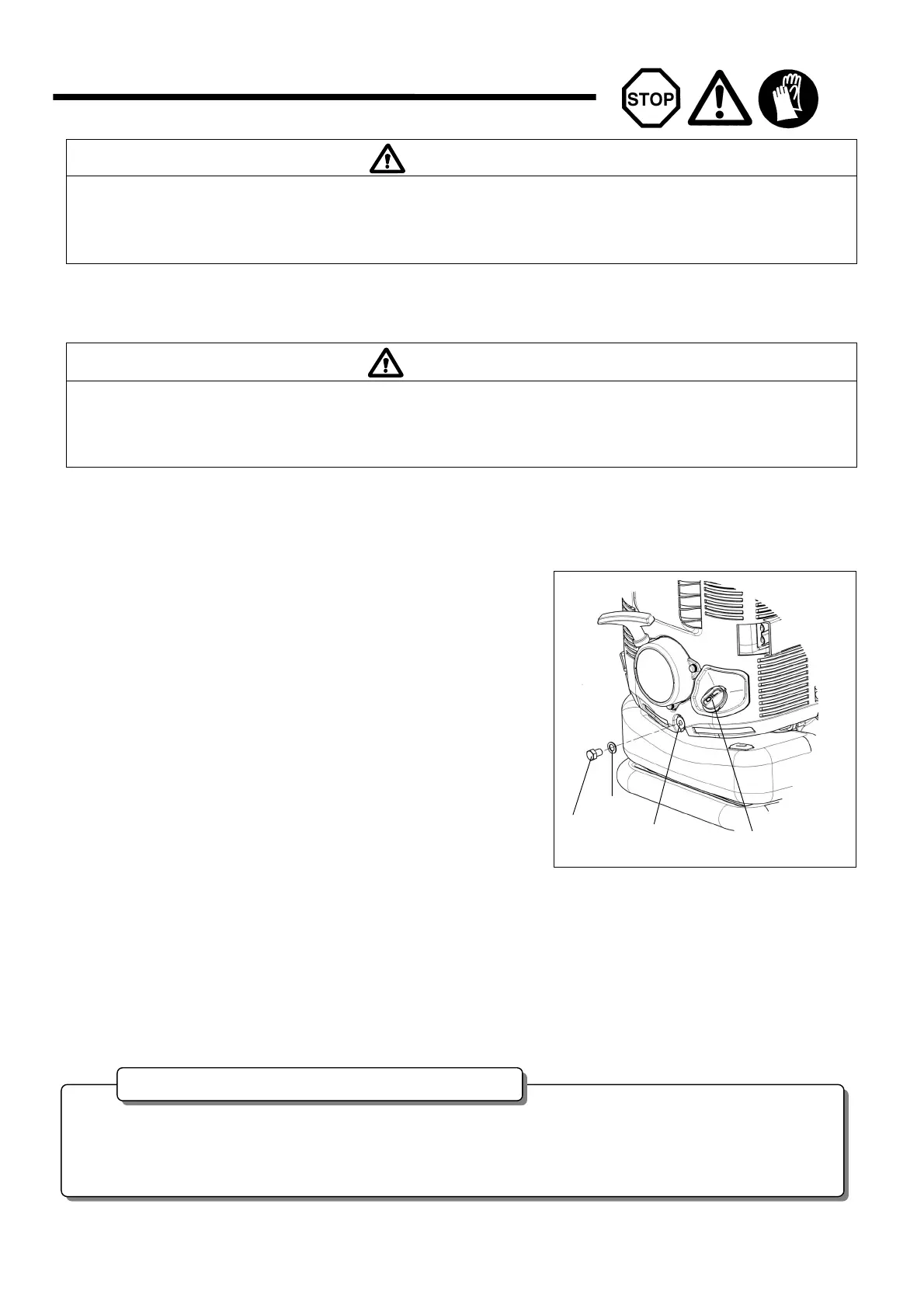 • Before inspection and maintenance, stop the engine and allow it to cool. Remove also the spark plug and plug cap.