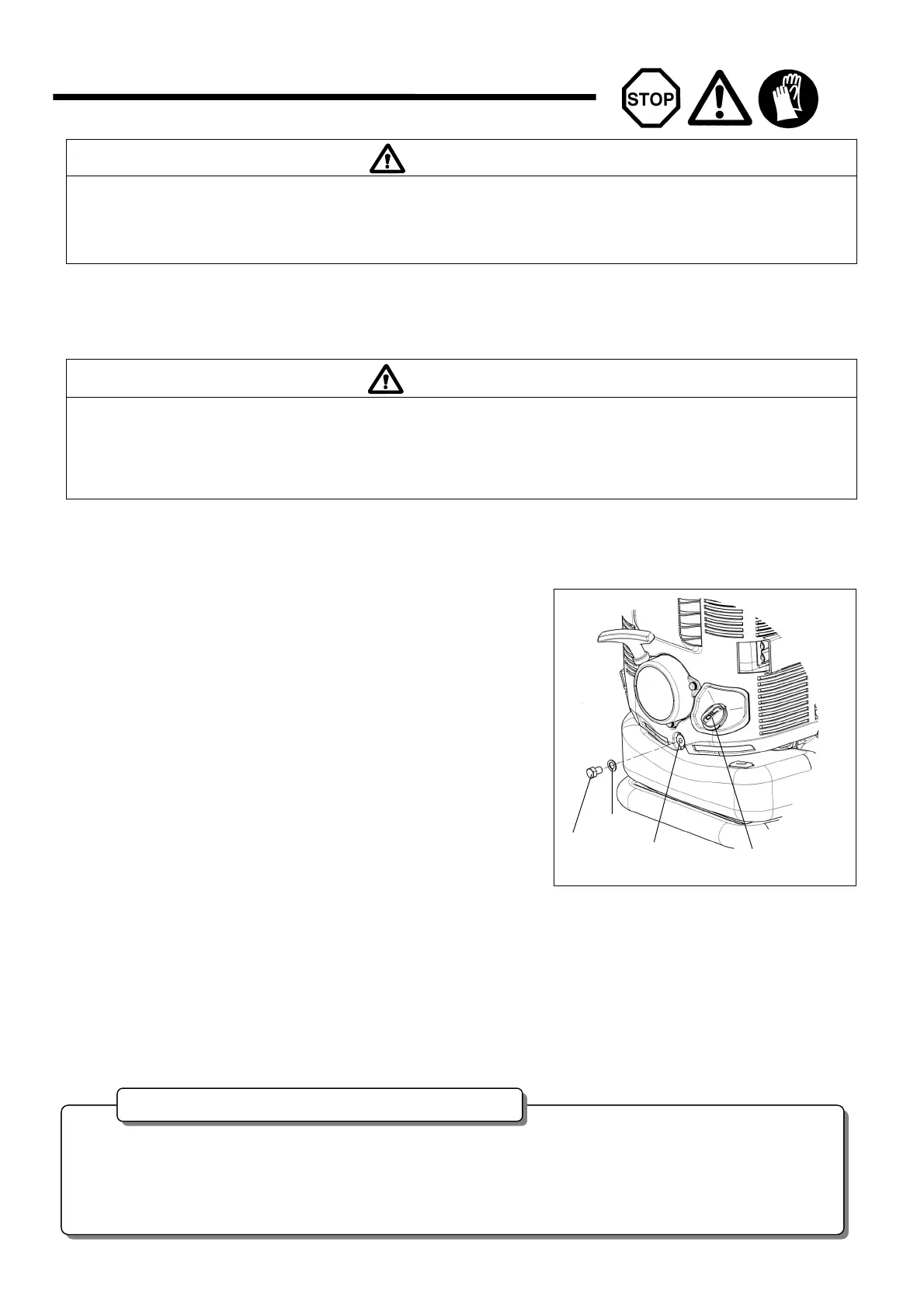 • Stop de motor en laat deze afkoelen voor u inspectie en onderhoud gaat uitvoeren. Verwijder ook de bougie en de bougiekap.
