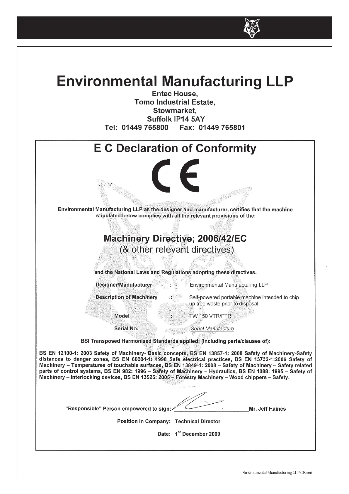 Timberwolf TW 150VTR - CERTIFICATE OF CONFORMITY; EC Declaration of Conformity