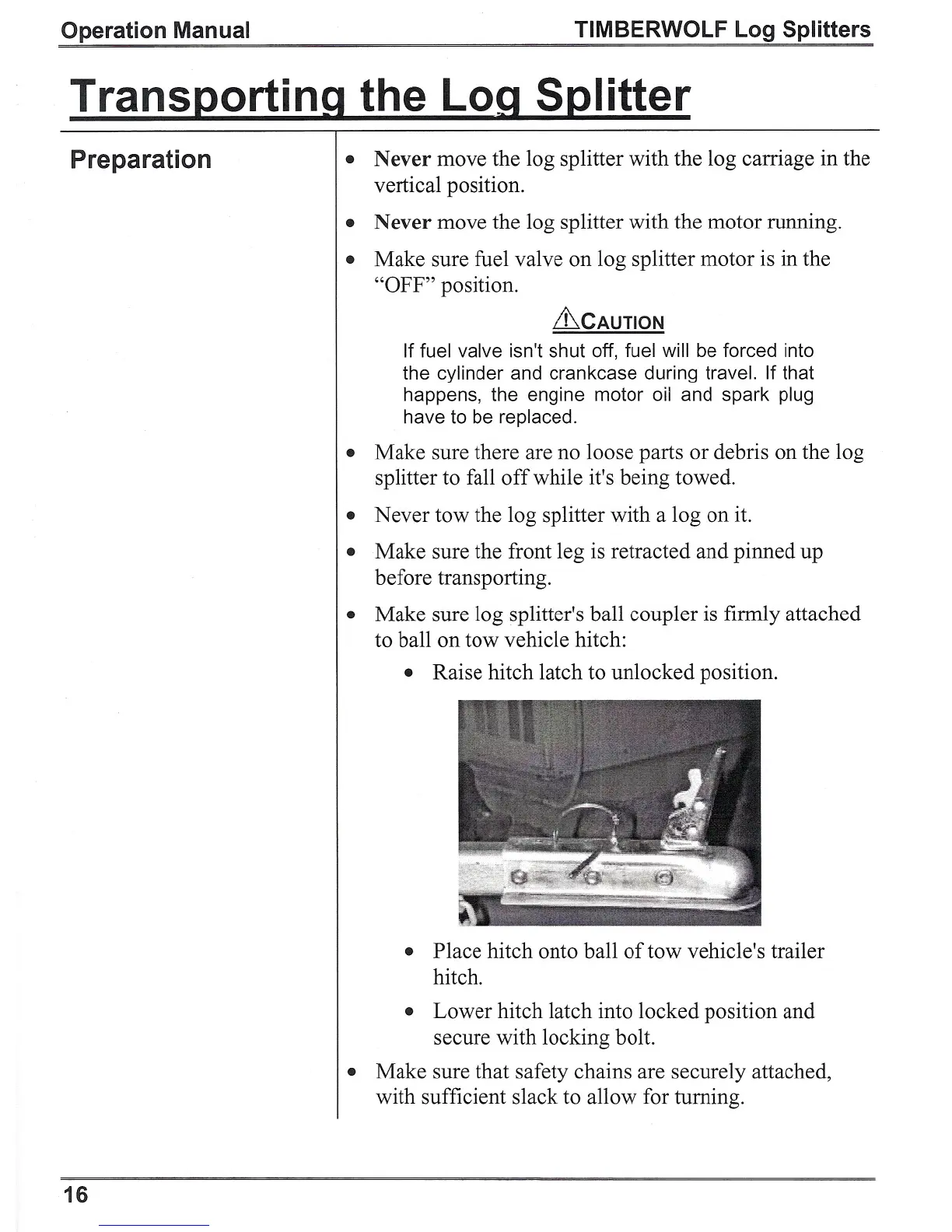 • Make sure log splitter's ball coupler is firmly attached
