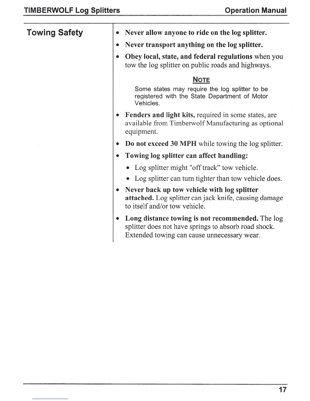 tow the log splitter on public roads and highways.