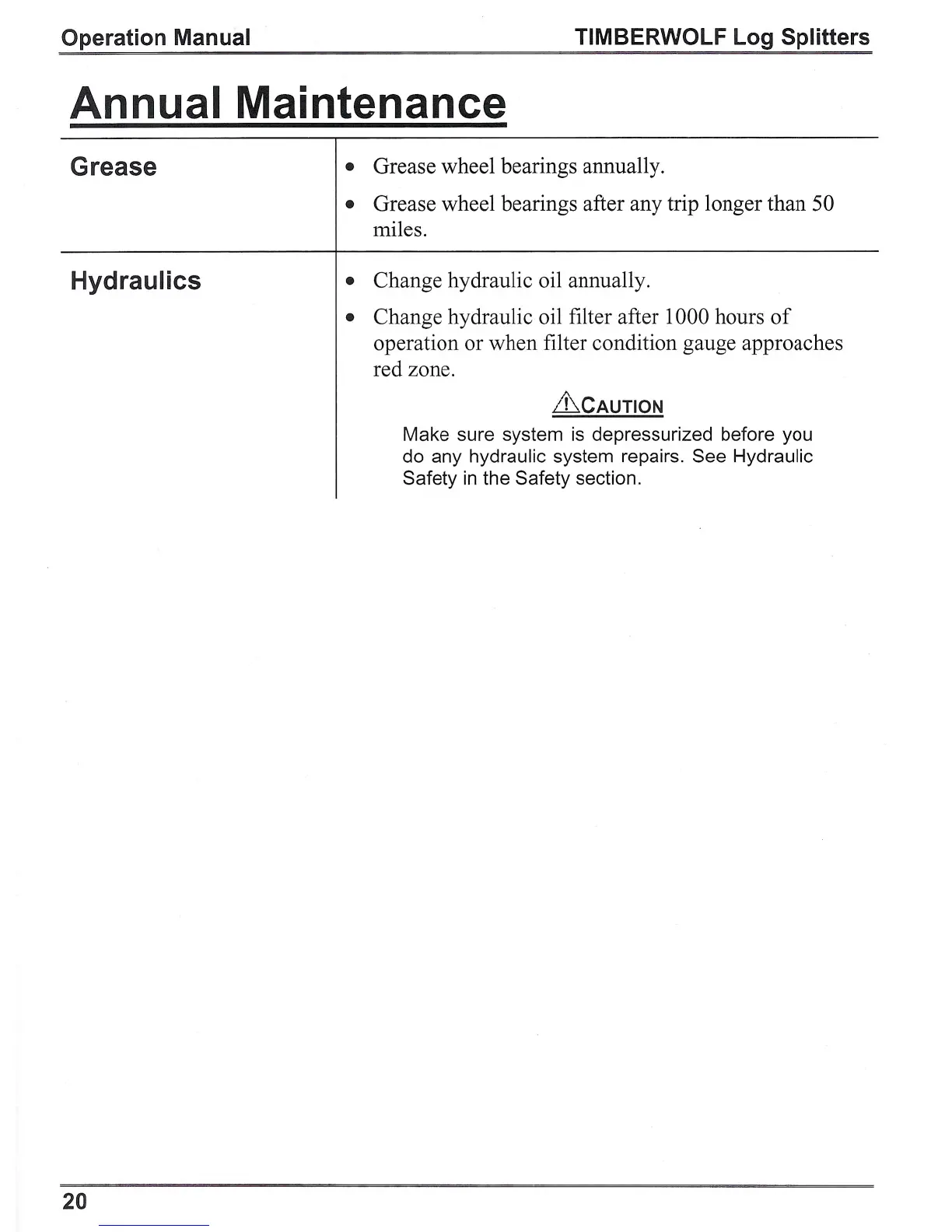 • Change hydraulic oil annually.