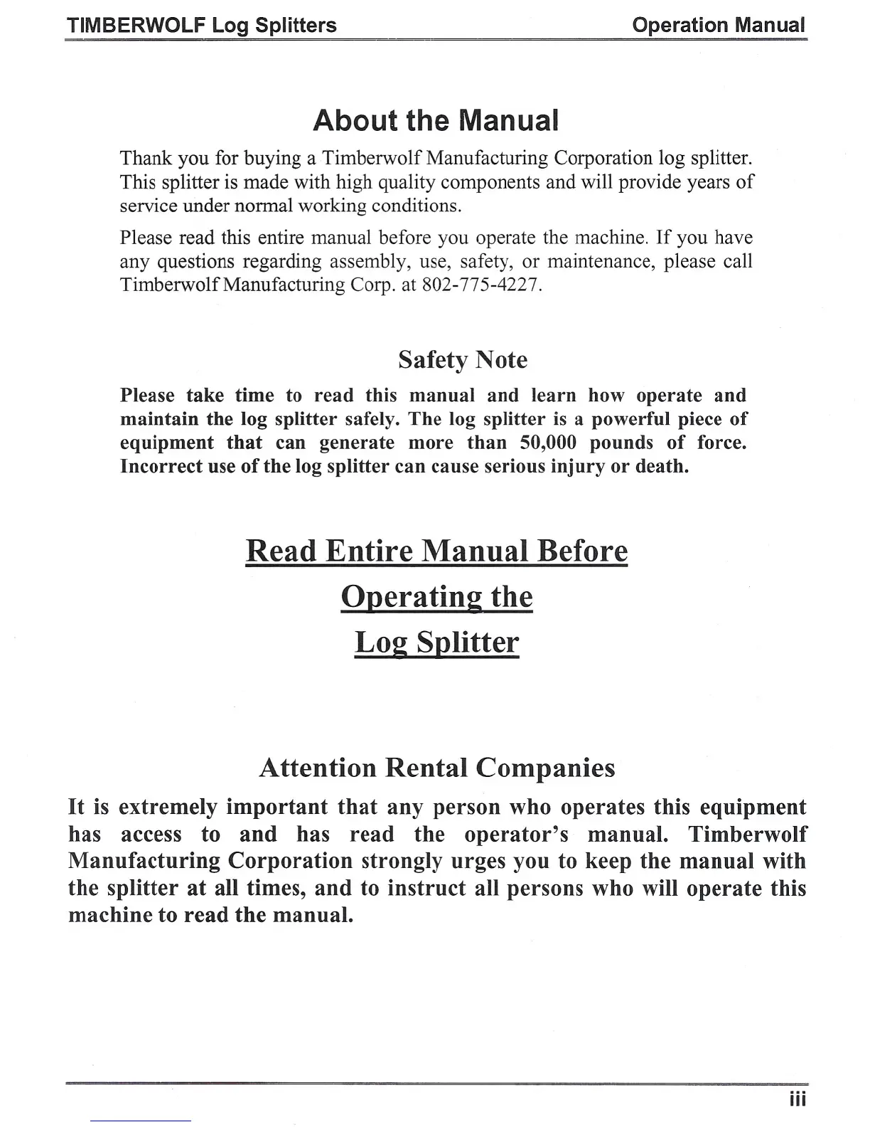 Thank you for buying a Timberwolf Manufacturing Corporation log splitter.