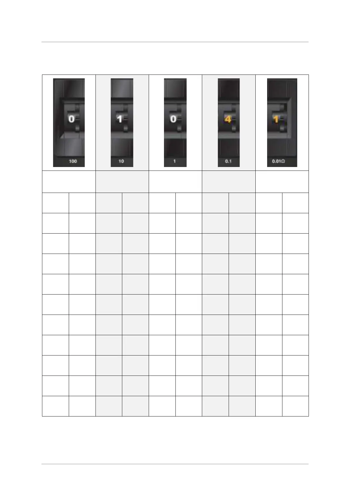 The below table shows the settings of each resistance decade using the dials.