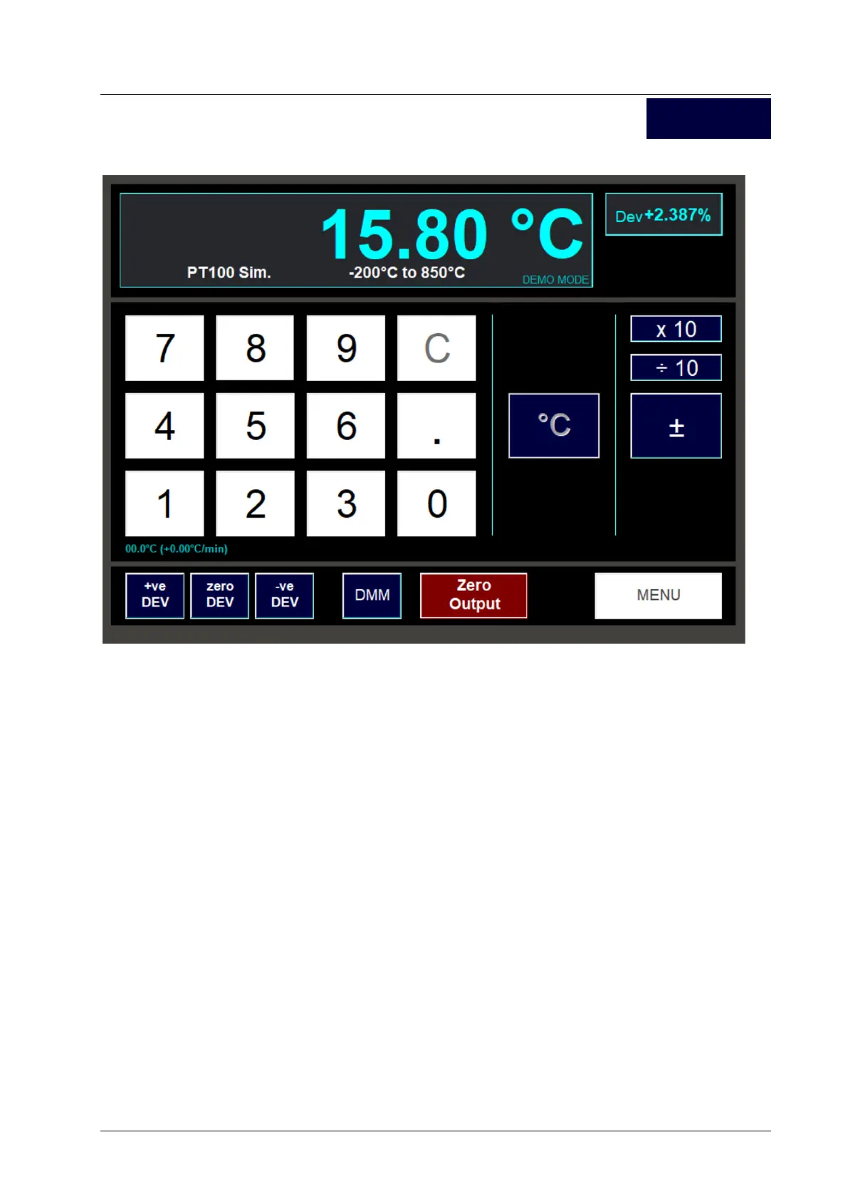 Pressing the Zero Output button sets the simulated output temperature to zero degC.