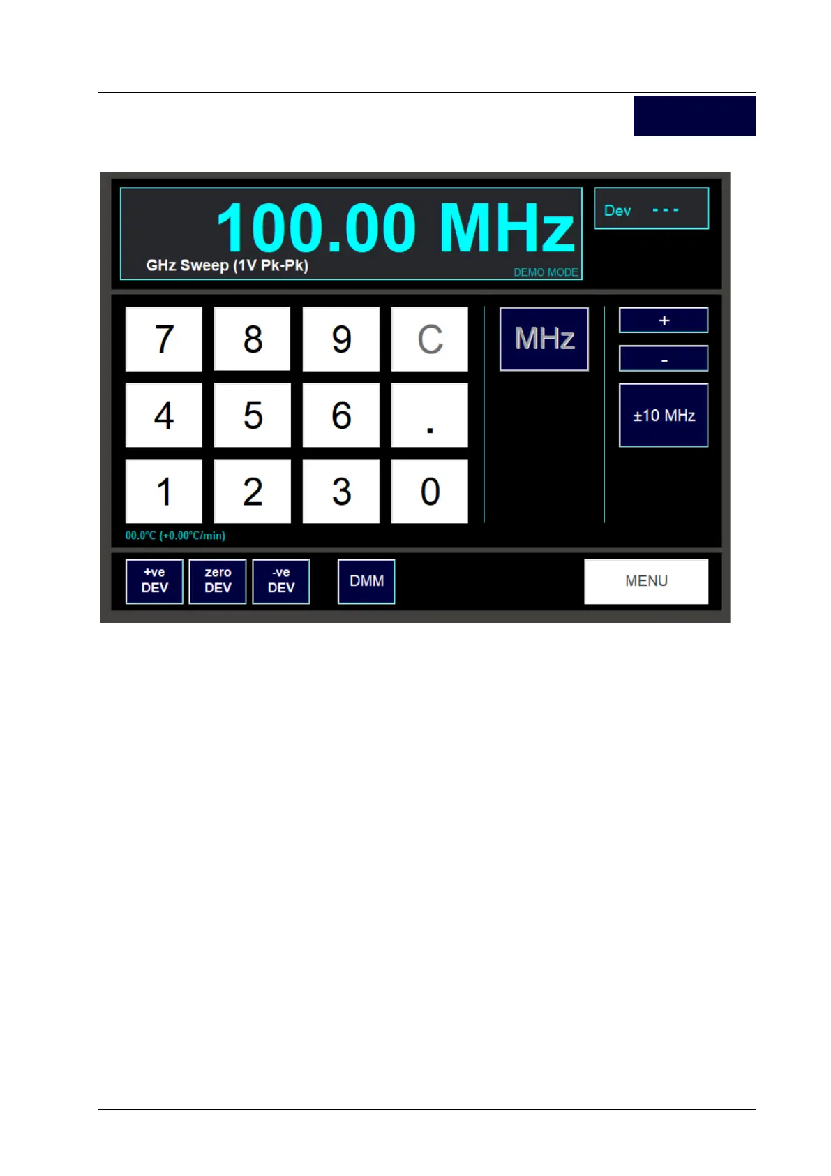 The increment/decrement amount is selected by pressing the “+/- 1, 10, 100MHz” button.