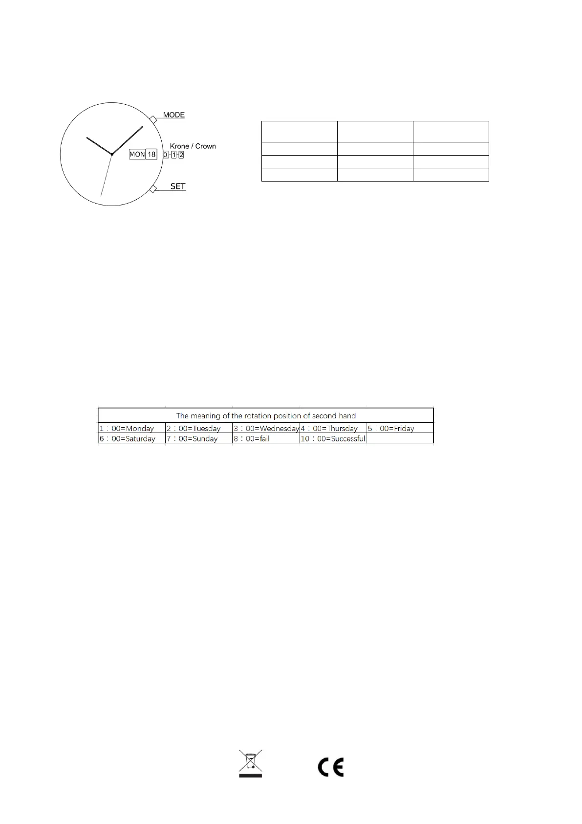 : the second hand will show the day of the week (as per below table)