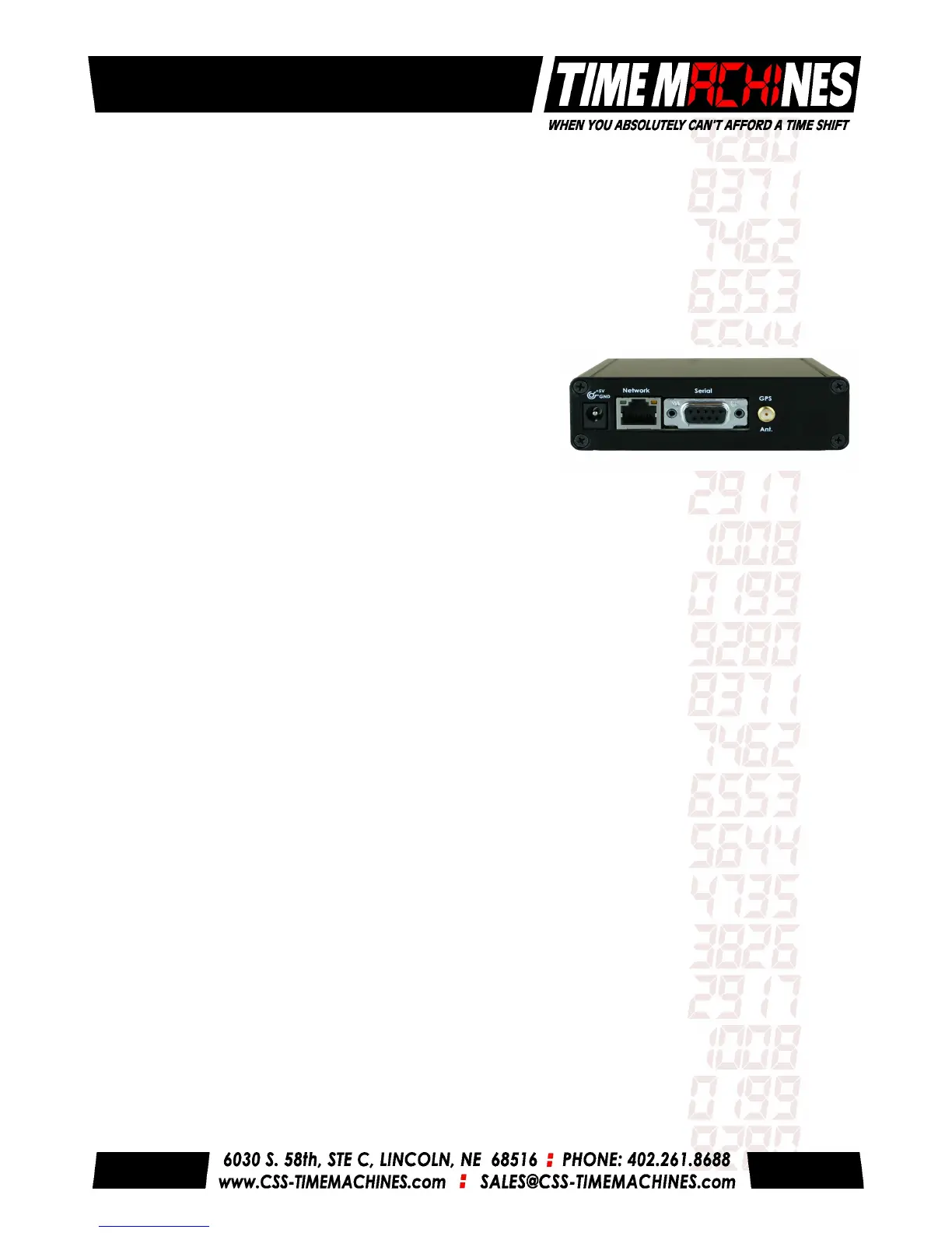 120VV outlet and the barrel connector to the rear of the Time Server. The time server will begin trying