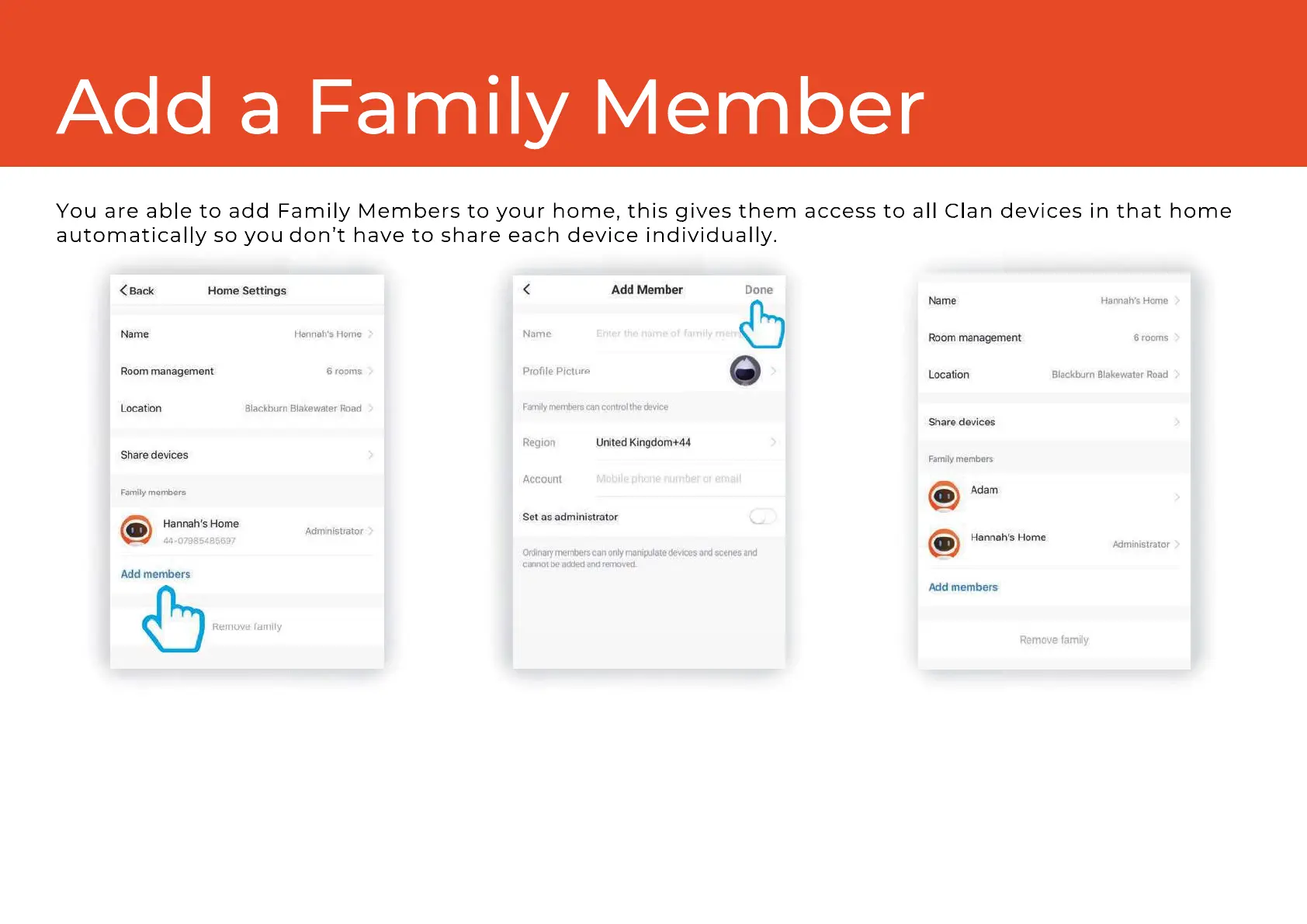 Time2 Bella - Adding a Family Member to Clan Home; Initiating Family Member Addition; Member Account and Privilege Setup; Viewing Added Family Members