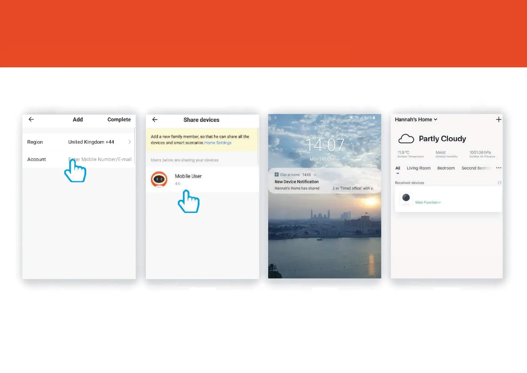 Time2 Bella - Completing Bella Device Sharing; Finalizing Share with Email; Shared Device Appearance in App; Notification of Device Sharing