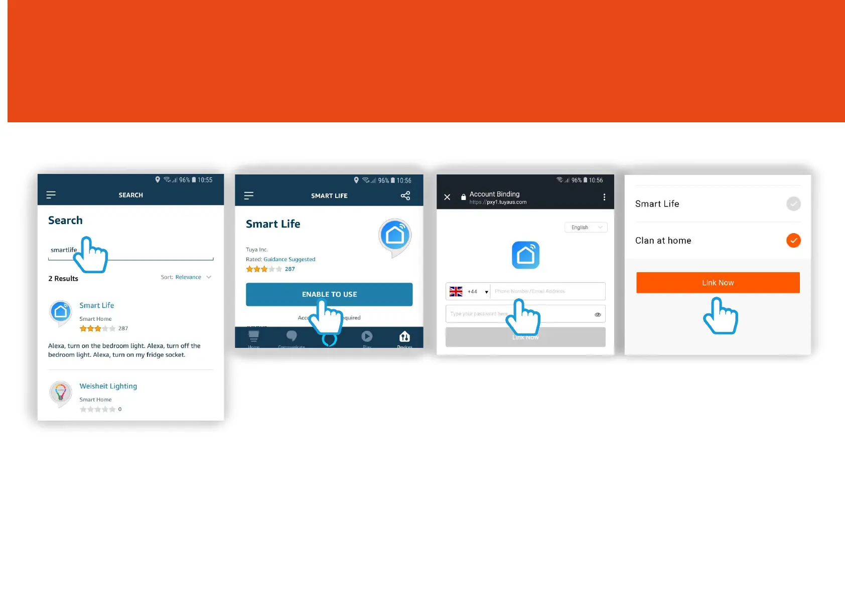 Time2 Oscar3 - Control with Amazon Alexa - Linking Account; Step 5 Tap the Search icon on the top-right corner of the page and search Smartlife; Step 6 Click the Smart Life skill then tap Enable to Use; Step 7 Use your Clan at Home Username and Password to log in. Then tap “Link Now”