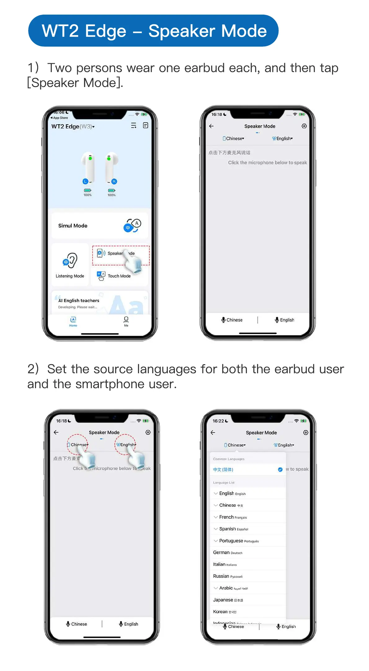 2) Set the source languages for both the earbud user