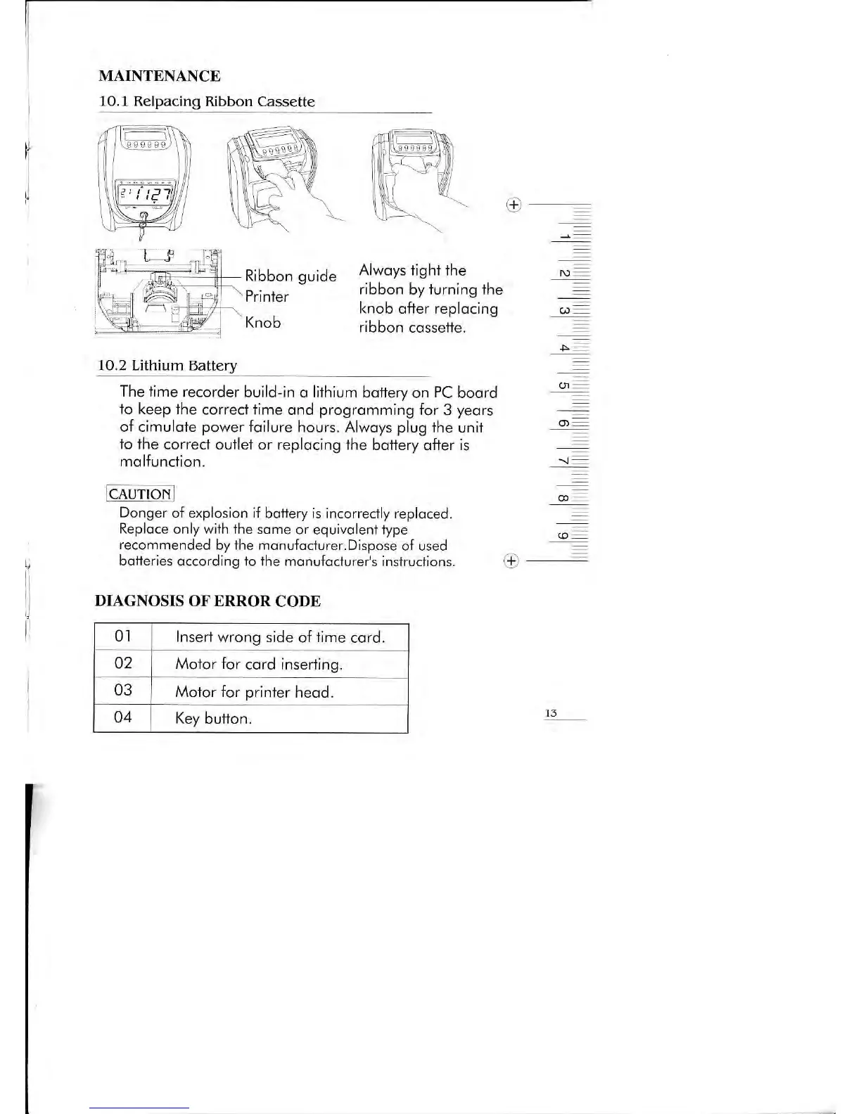 Timemaster TM920 - Maintenance; 10.1 Relpacing Ribbon Cassette; 10.2 Lithium Battery; Diagnosis of Error Code