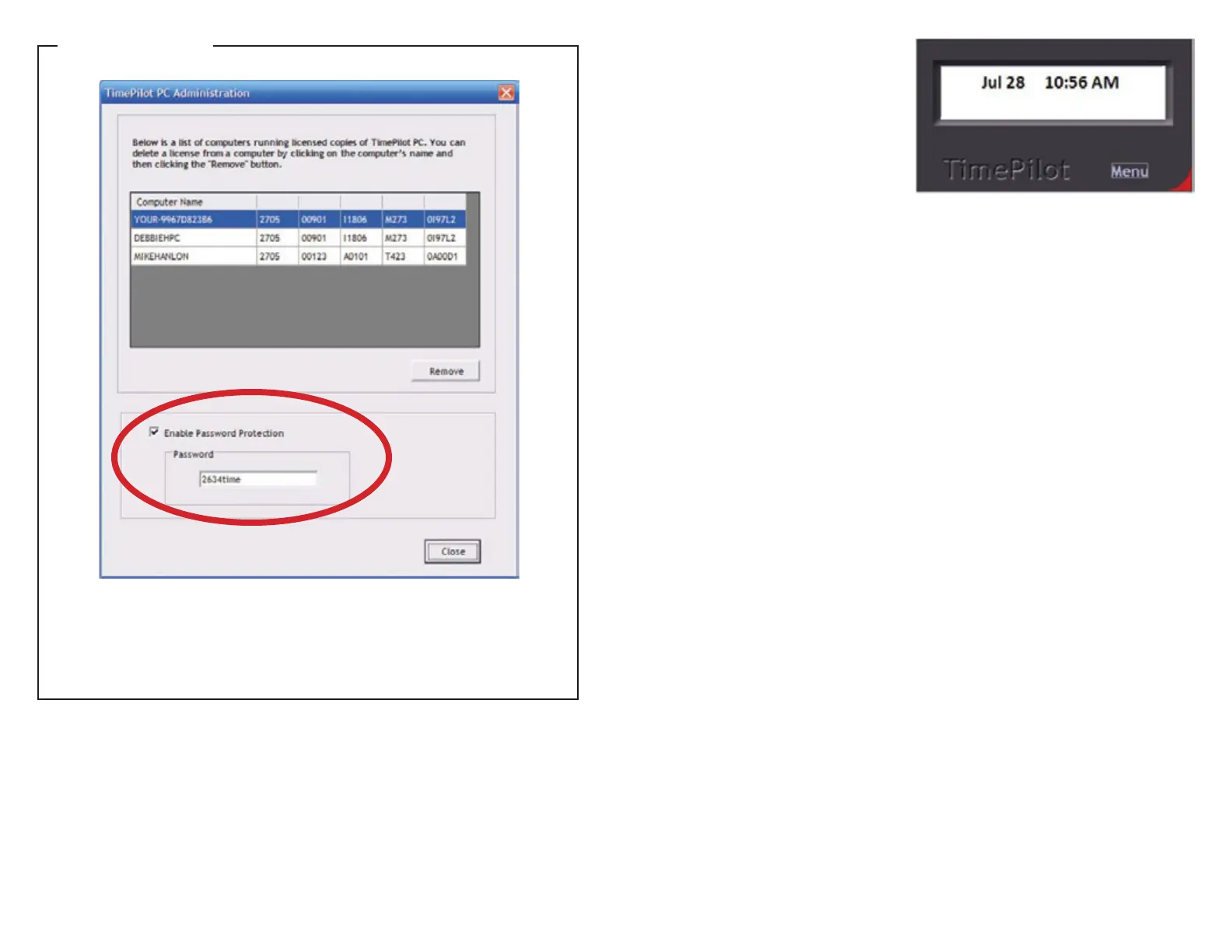 “Administra ve” menu, then “TimePilot PC Administra on.” Check the “Enable Password