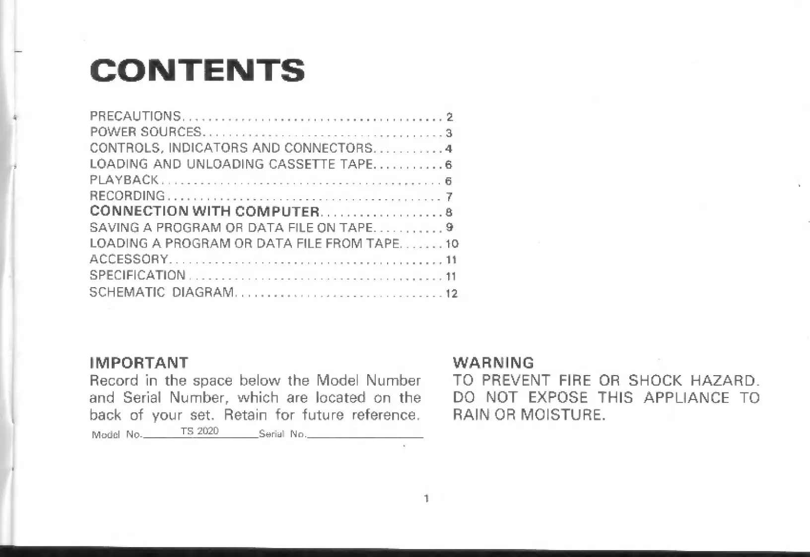 Timex Sinclair 2020 Computer Program Recorder - Table of Contents