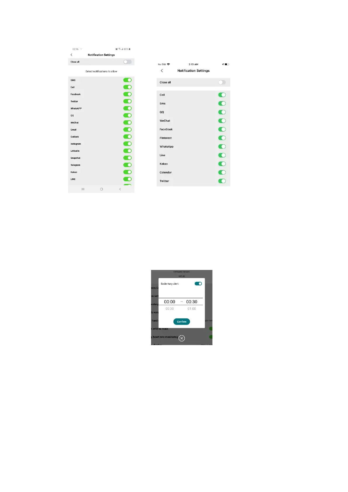 Set the start time and end time of sedentary reminder. Push the Sedentary alert button