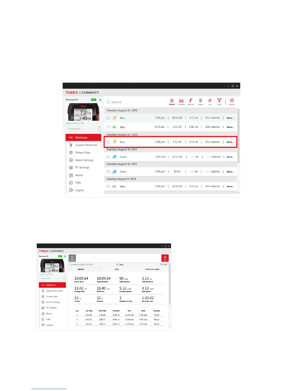 Revisión del ejercicio en Timex Connect