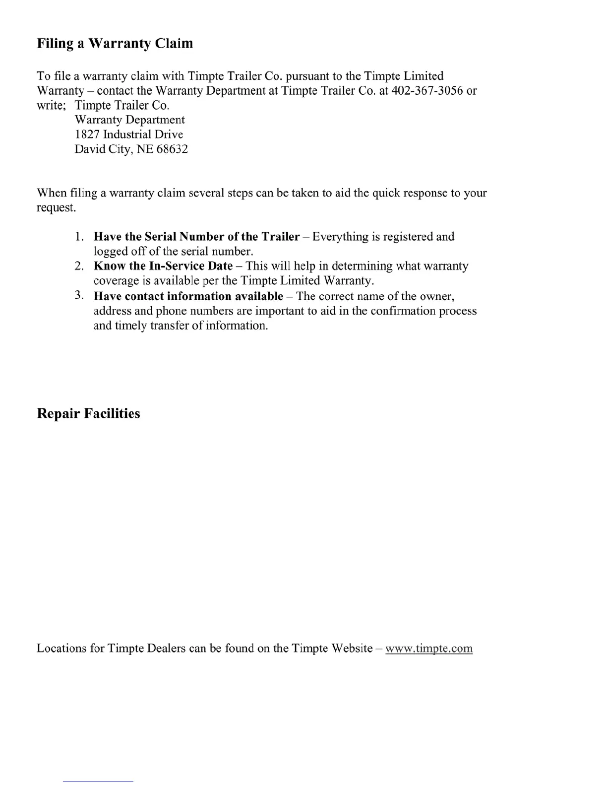 Timpte hopper - Filing a Warranty Claim