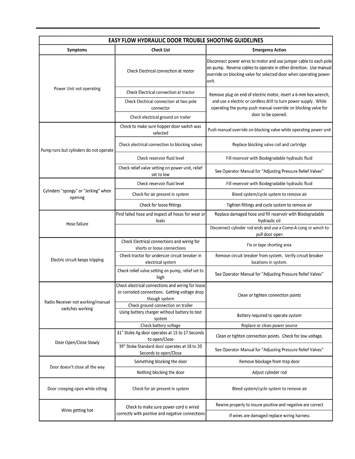 EZ-FLOW HYDRAULIC DOOR TROUBLE SHOOTING GUIDELINES