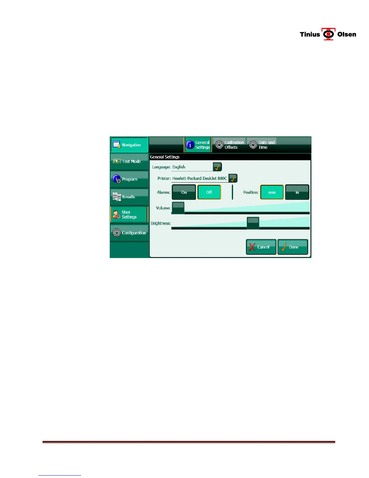 On the General Settings screen, the operator can select the optional printer, turn alarms on