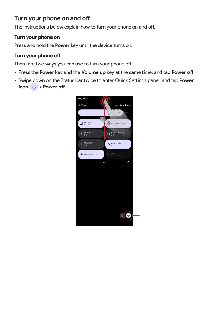 • Swipe down on the Status bar twice to enter Quick Seings panel, and tap Power