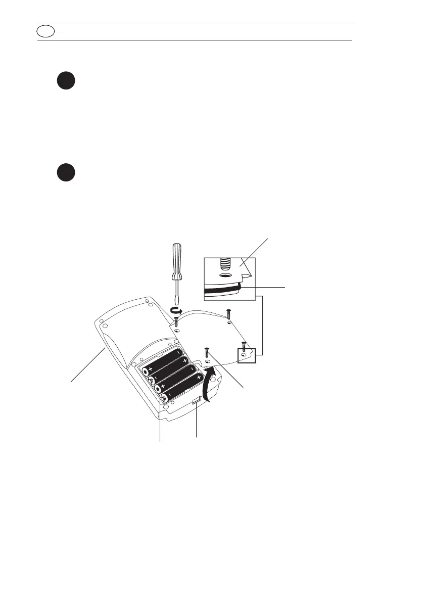 vedação (E) tem de estar inserida e a tampa do compartimento das pilhas (B) tem