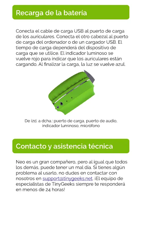 Tiny Geeks Neo - Carga de la Batería; Contacto y Asistencia Técnica