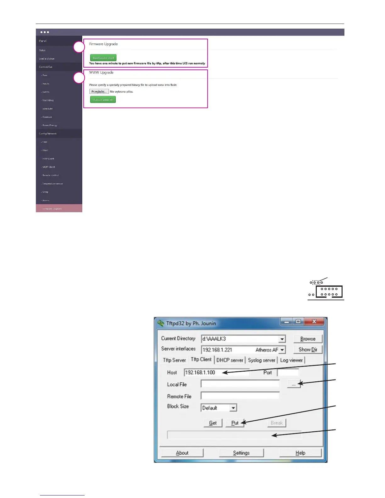purpose, in the Lan Controller menu „Firmware upgrade” select Bootloader Start and run the tftp client.