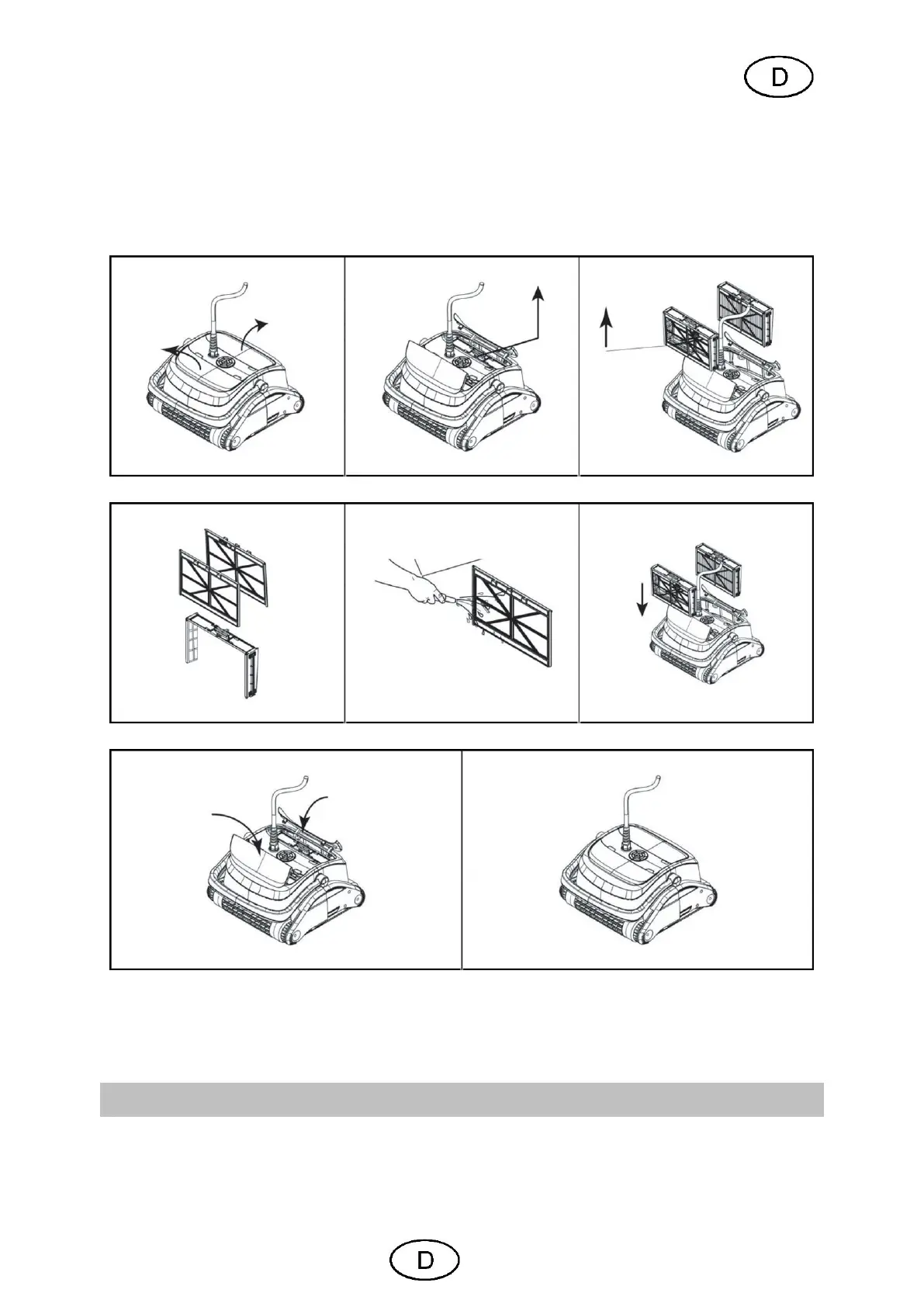 • Bitte entfernen Sie den gesamten Schmutz und Wasser aus dem Inneren des Poolroboters.