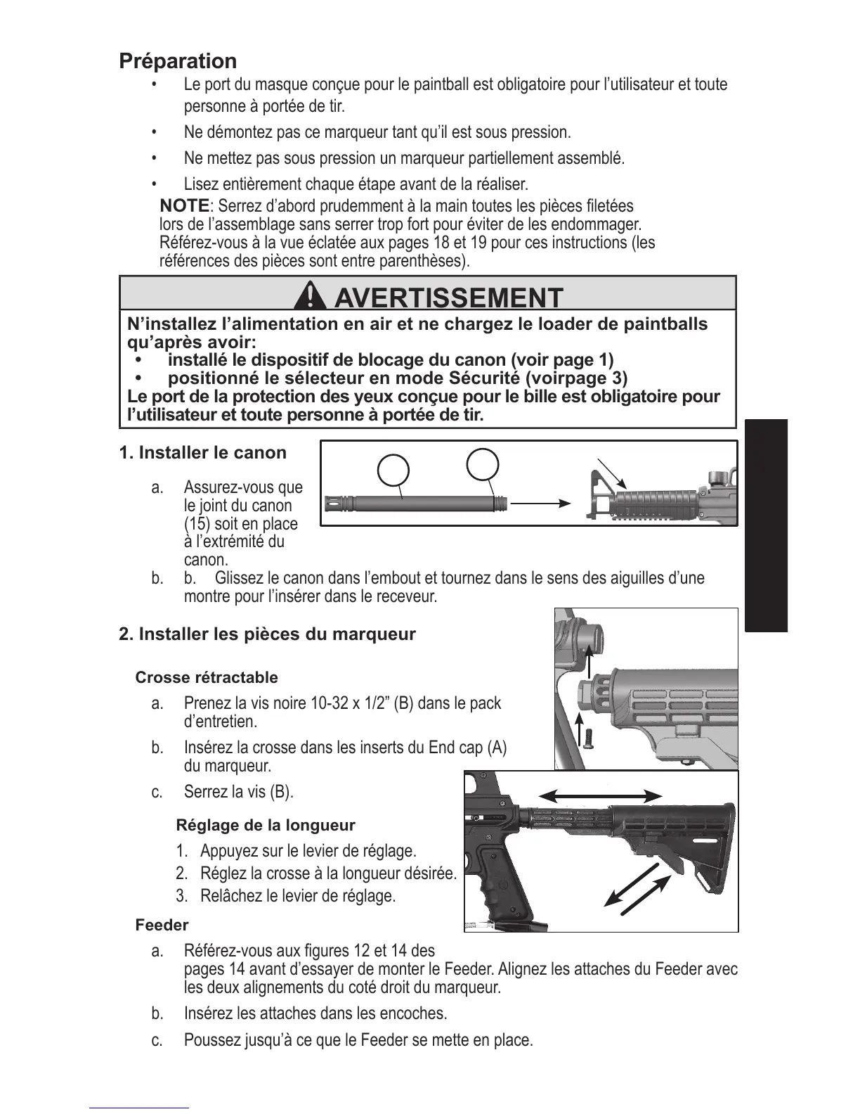 N’installez l’alimentation en air et ne chargez le loader de paintballs