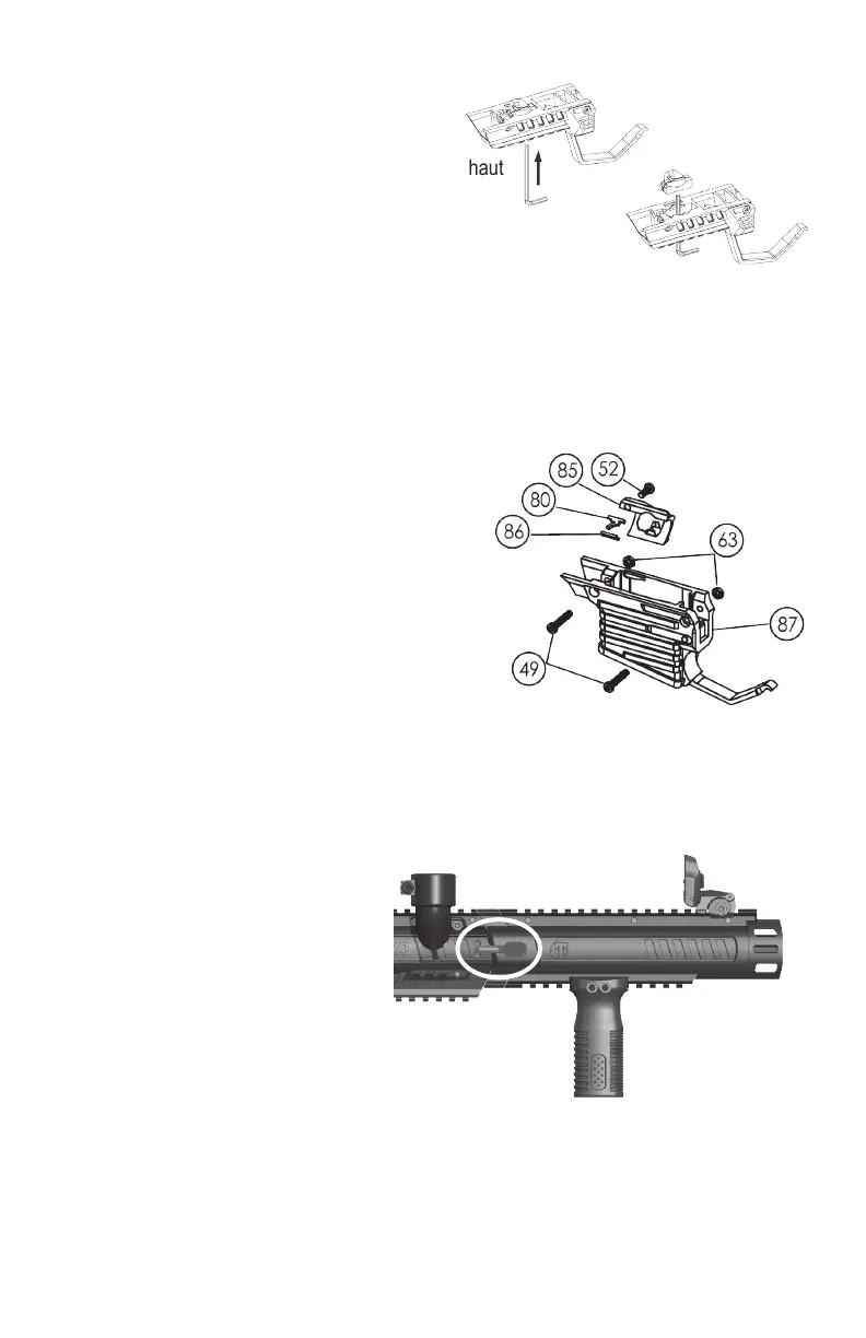 La poignée avant (65) peut être installée à n’importe quelle rail Picatinny à l’aide de