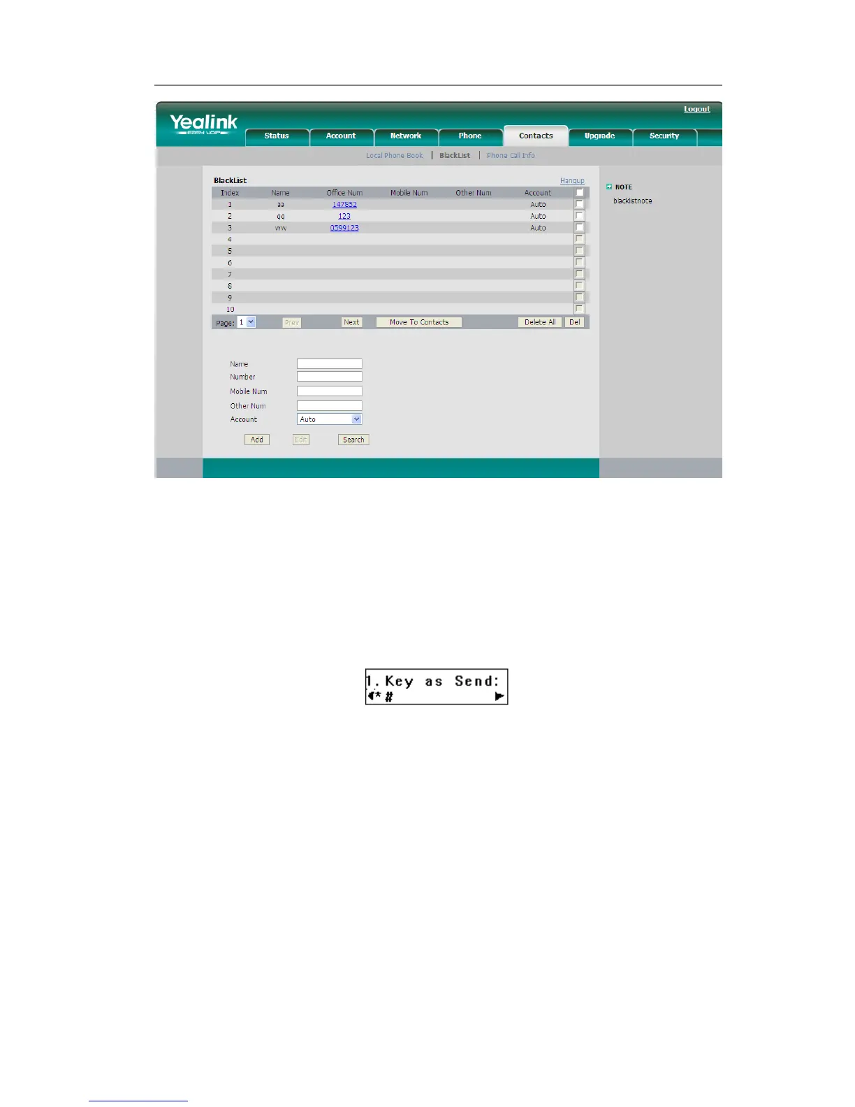 1) Press MENU->Features->Key as Send->OK to enter the configuration page.