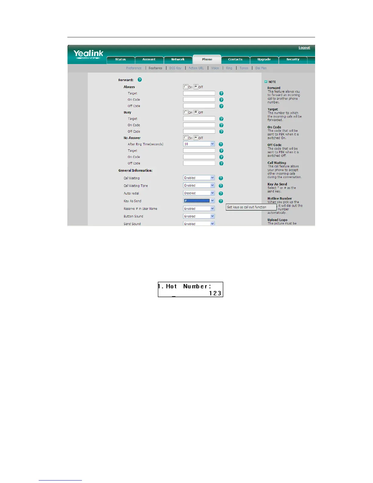 2) Enter the hot line number and set the HotLine Delay (for example, 20 seconds),