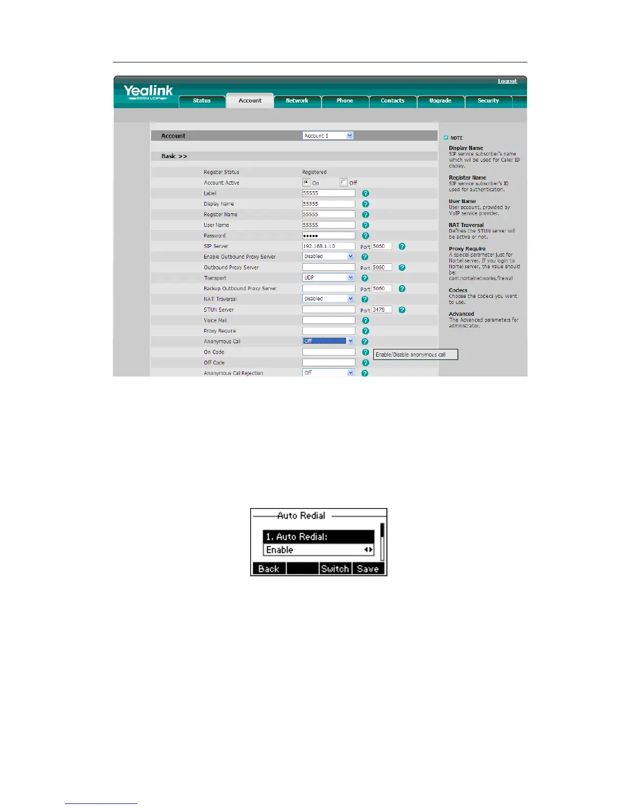 1) Press Menu->Features->Auto Redial ->Enter to enter the configuration page.