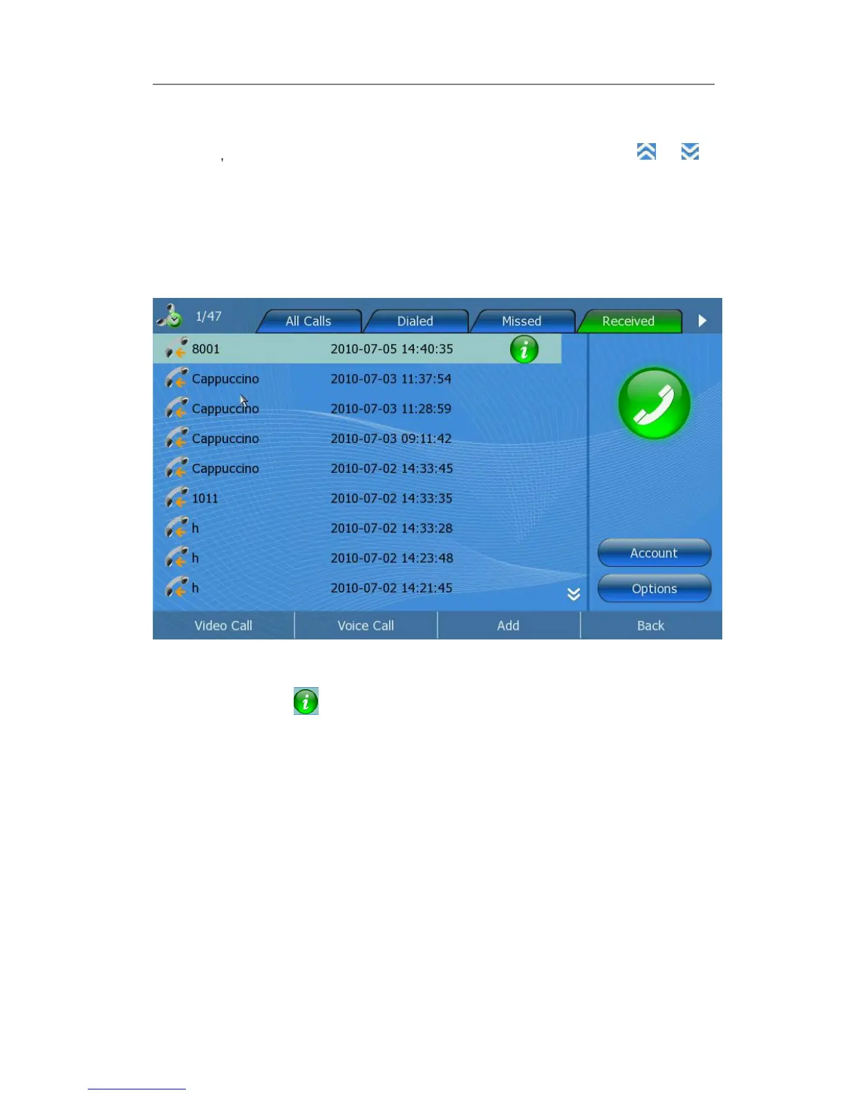 1) Click Call History option to review the call list.