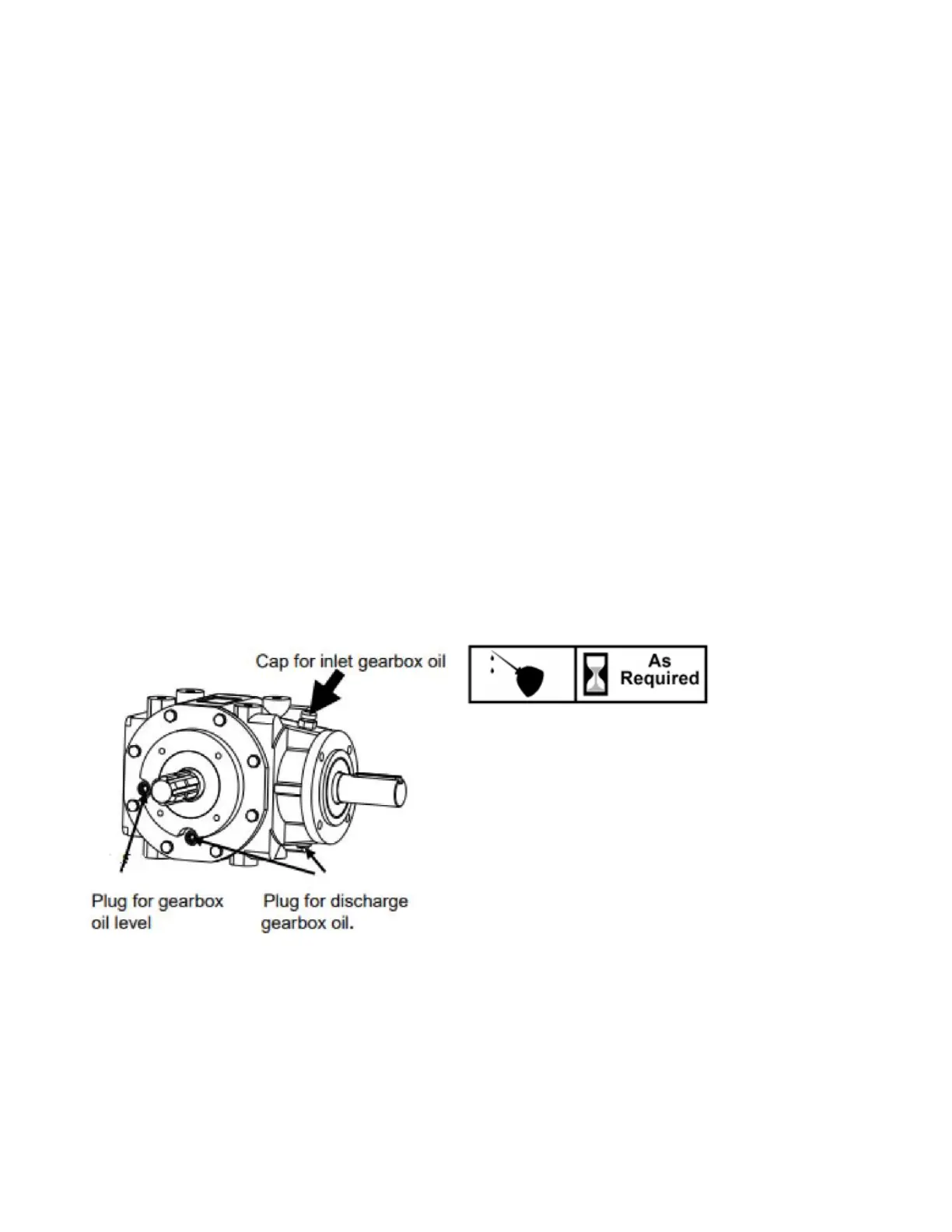 Check oil level in gearbox by removing the cap located on the right-hand side. Oil should be