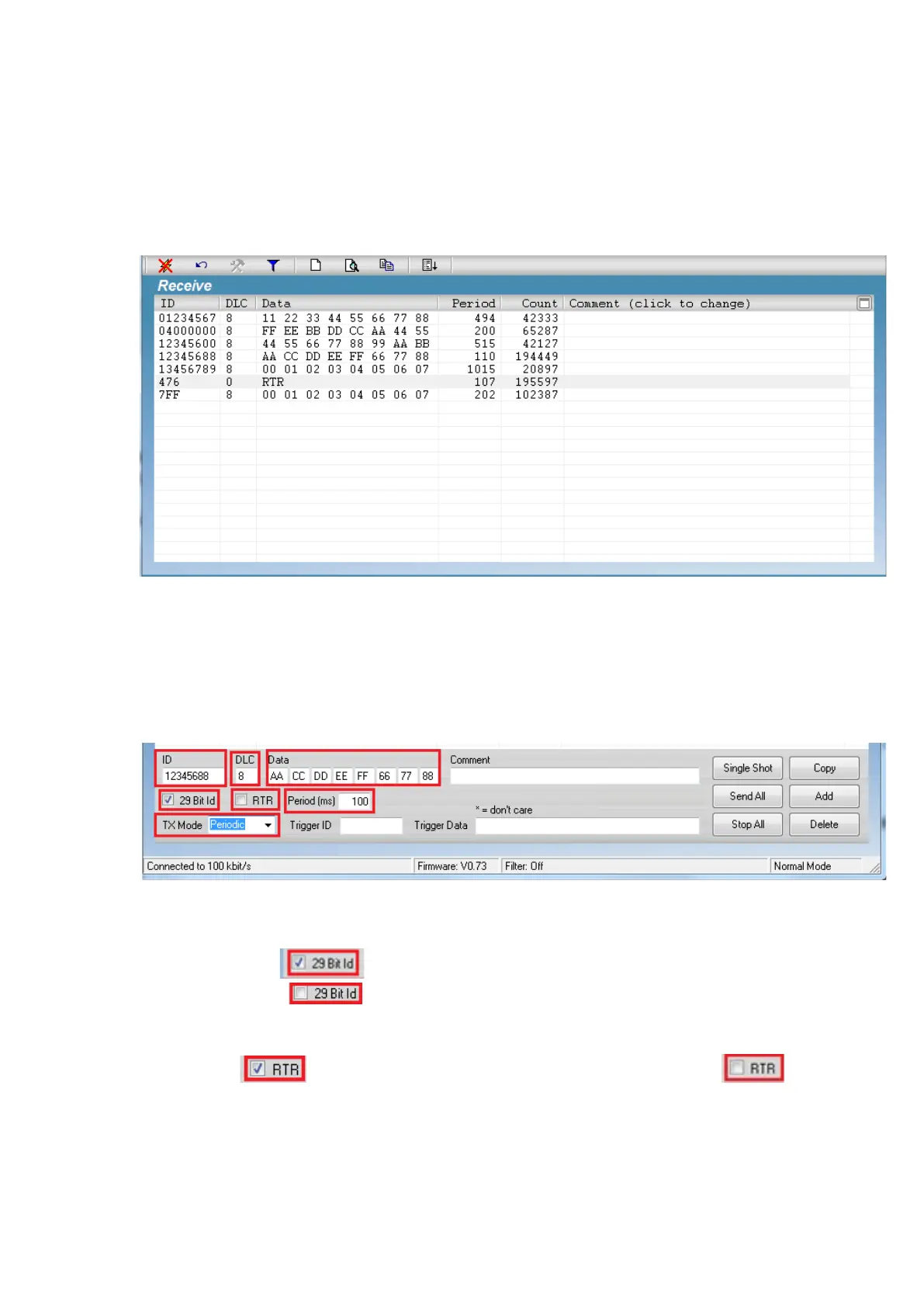 Check “RTR” for a remote request frame mode or uncheck “RTR”