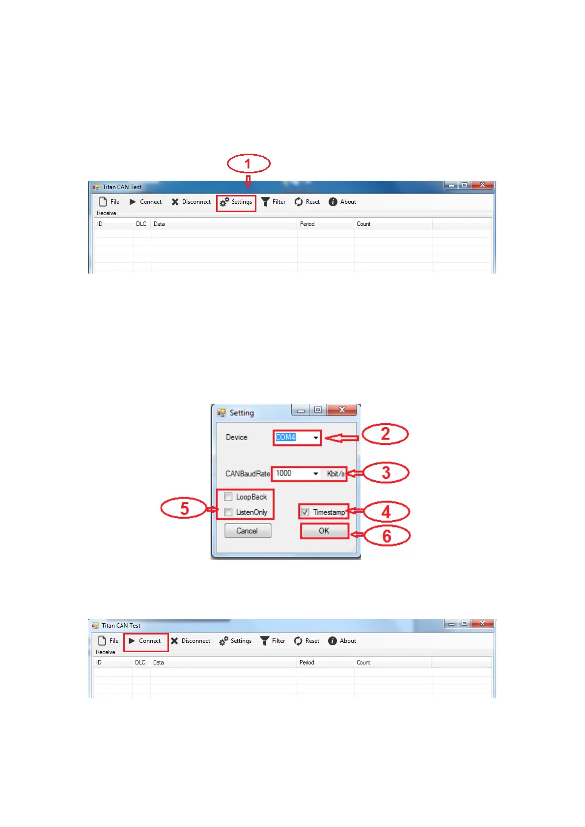 1. Open Titan CAN test program and click “Settings” under the menu.