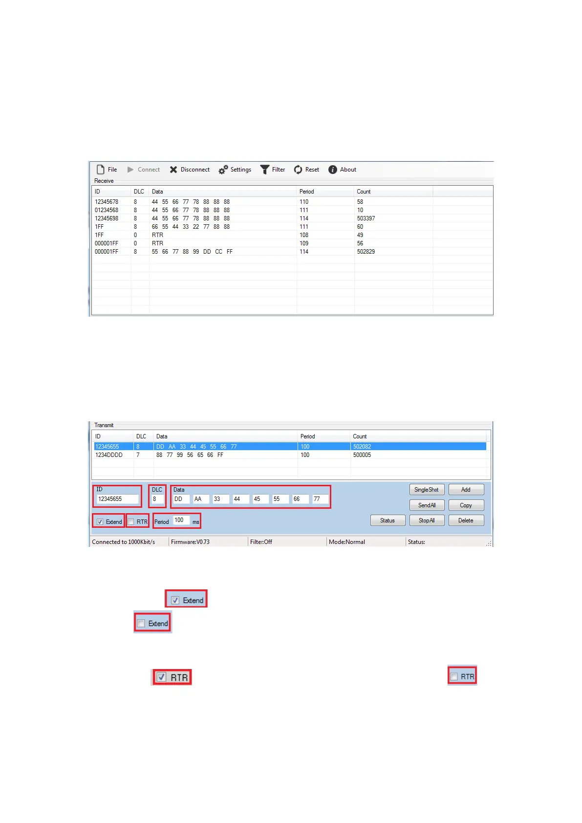 Check “RTR” for a remote request frame mode or uncheck “RTR” for