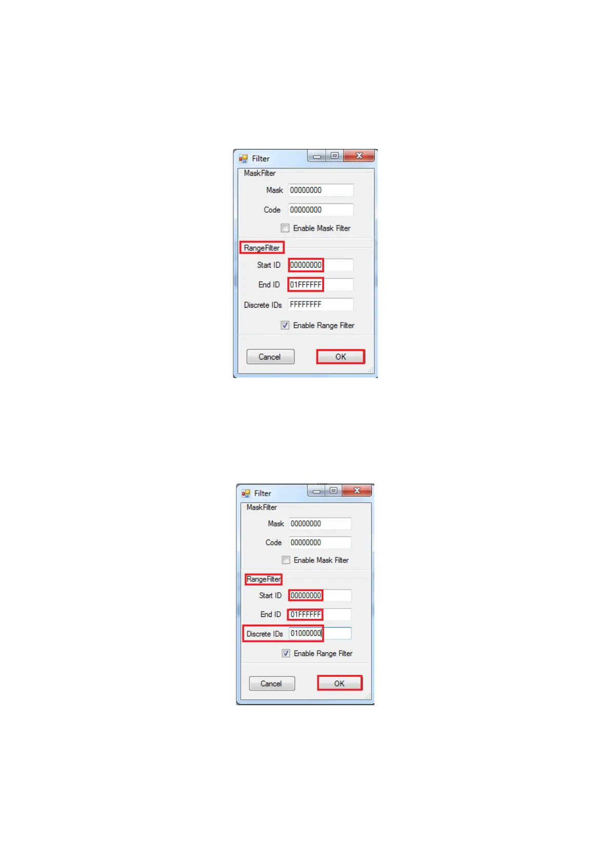 Range Filter example: After setting “Start ID” to 00000000 and “End ID” to 01FFFFFF,