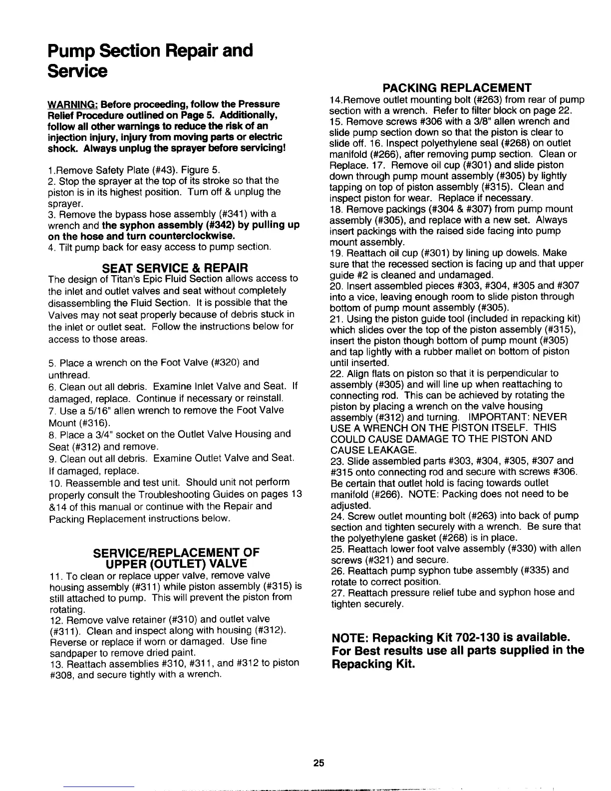 Titan epic 440E - Pump Section Repair and Service; Seat Service and Repair; Service;Replacement of Upper (Outlet) Valve; Packing Replacement