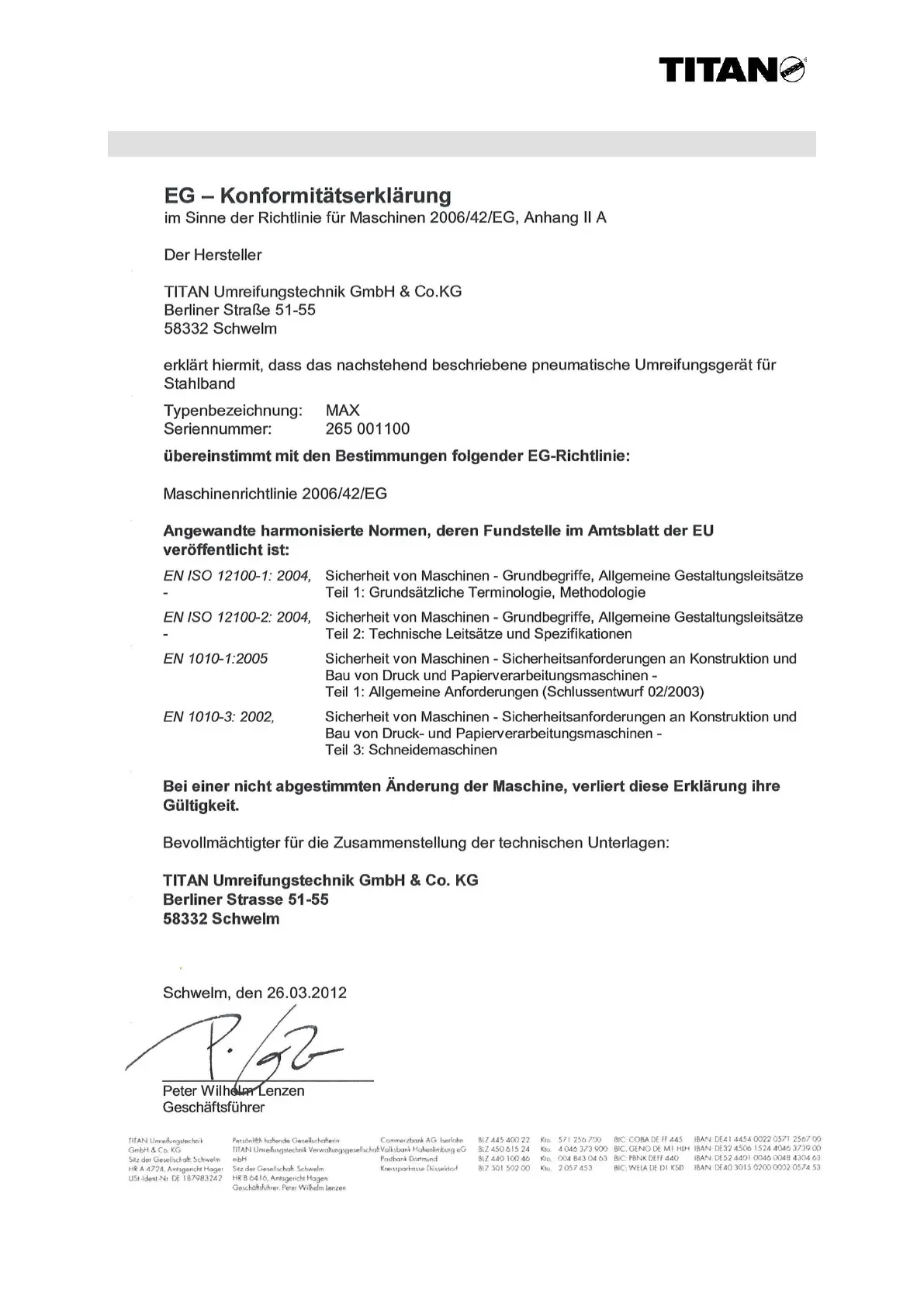 Titan MAX - Konformitätserklärung; EG - Konformitätserklärung; Angewandte harmonisierte Normen