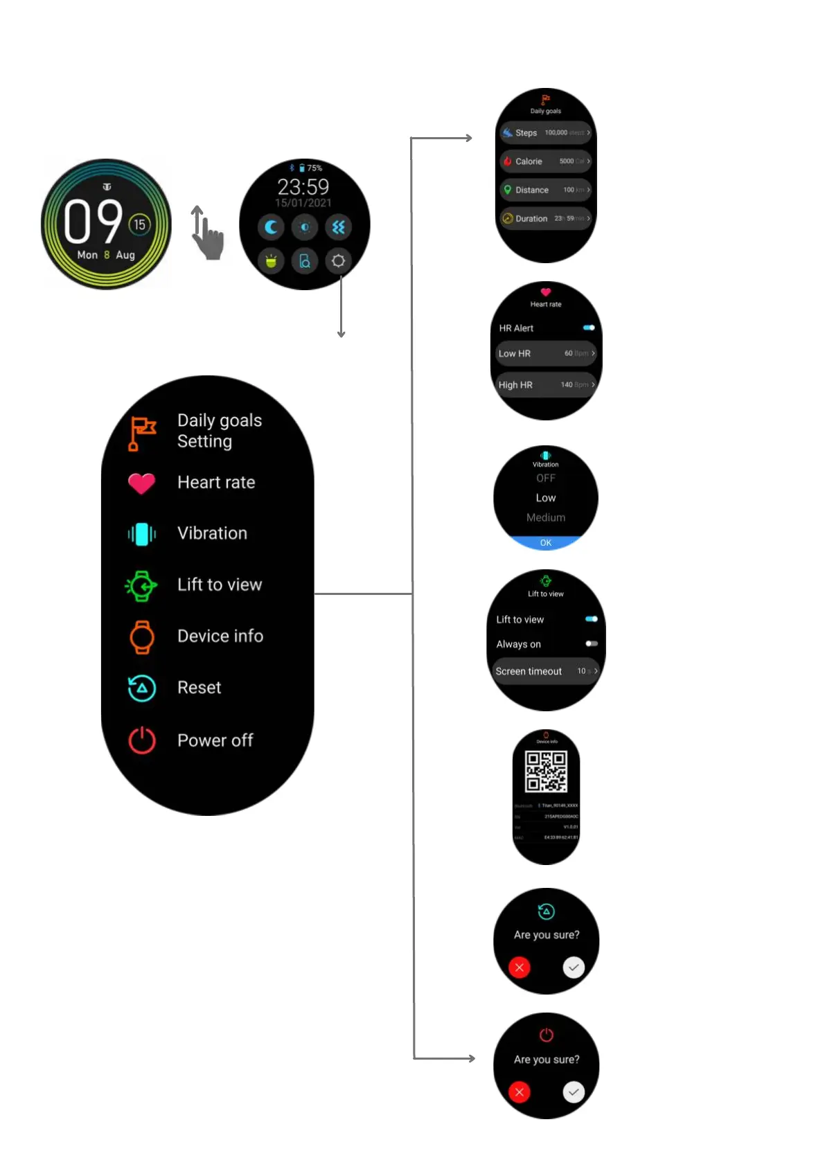 Titan SMART PRO - Watch Settings; Configure Daily Goals and HR Alerts; Adjust Vibration and Lift to View; Manage Device Info and Power