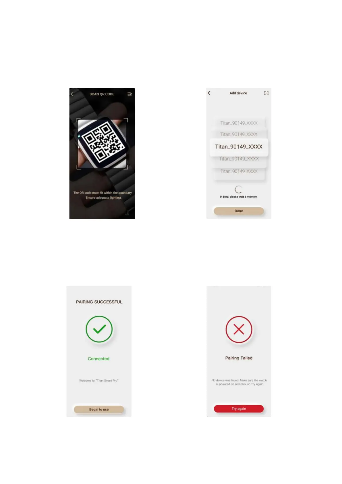 Titan SMART PRO - Connecting to Smartphone; Scan QR Code for Pairing; Select Watch Model in App; Pairing Success and Failure